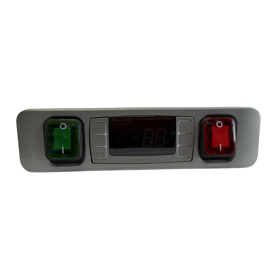 Controllerul Copeland permite gestionarea funcțiilor esențiale precum controlul compresorului, ciclurile de dezgheț și semnalizarea alarmelor, asigurând o funcționare eficientă și sigură a sistemelor frigorifice. Configurația cu două butoane permite operarea facilă a echipamentului, inclusiv funcții de pornire, oprire și setări.
